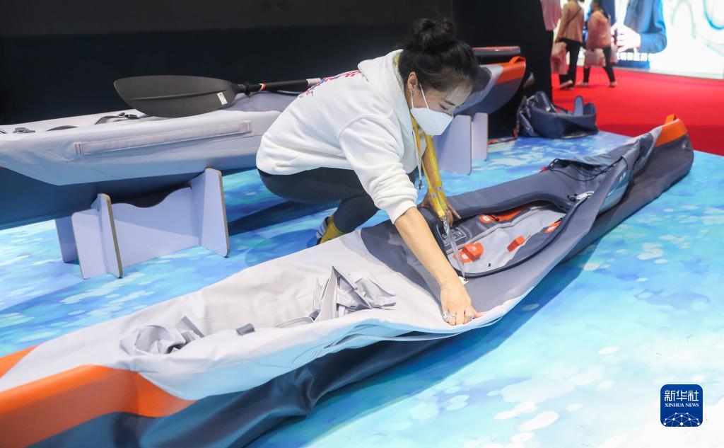 工作人員在第三屆進博會消費品展區的迪卡儂展臺演示可折疊皮劃艇如何安裝(2020年11月6日攝)。新華社記者 丁汀 攝