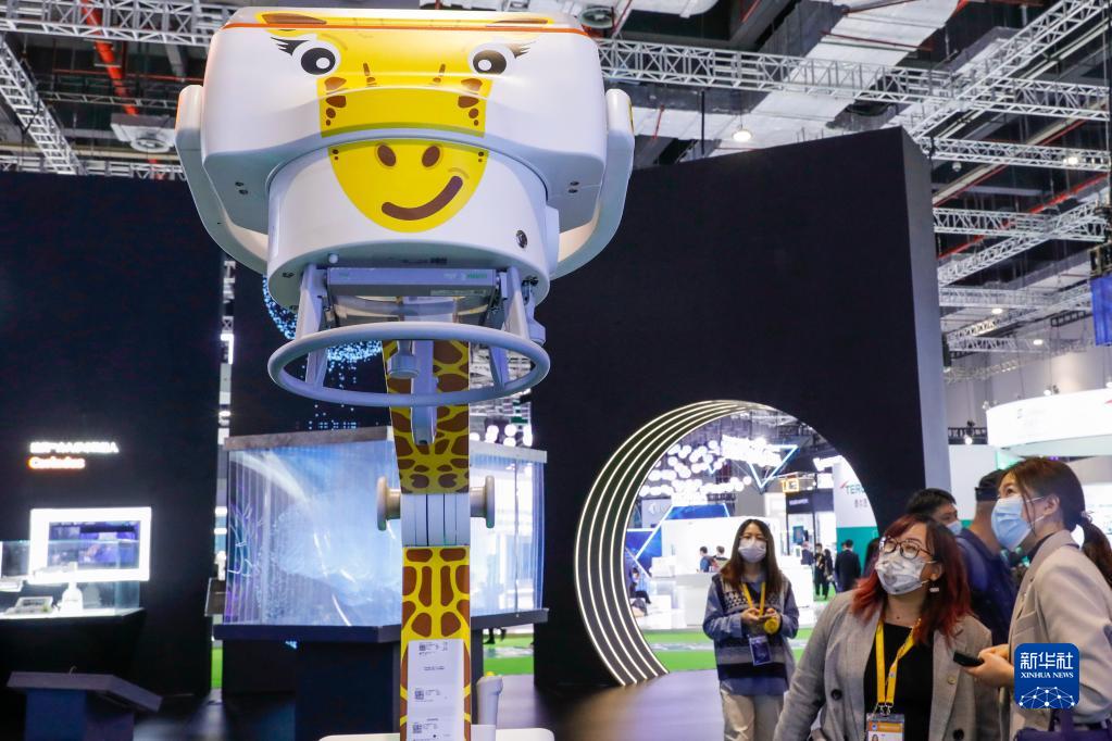 參觀者在第四屆進博會公共衛生防疫專區的西門子醫療展臺觀看一臺移動式攝影x射線機(2021年11月6日攝)。新華社記者 張玉薇 攝