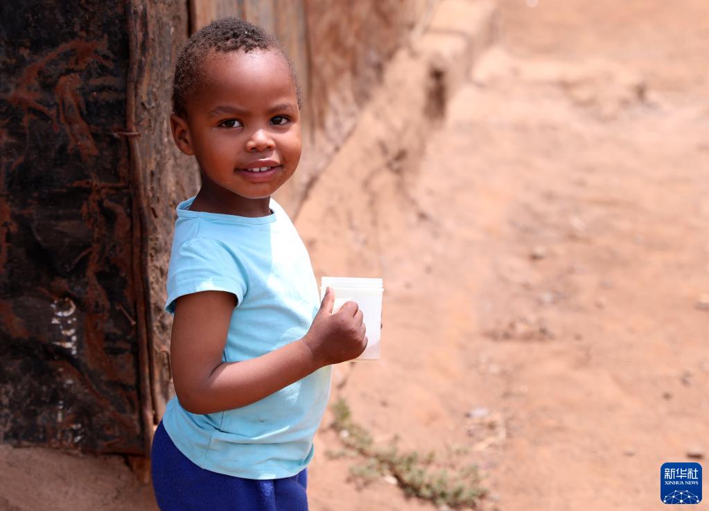 11月10日,一個孩子手握水杯站在肯尼亞基姆卡的一座幼兒園內。
