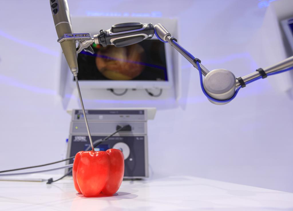 11月7日在第五屆進博會德國卡爾史托斯展臺拍攝的電子內窺鏡。新華社記者李京攝