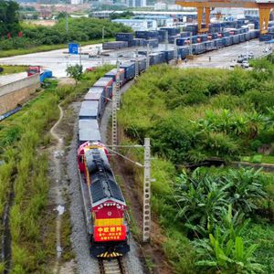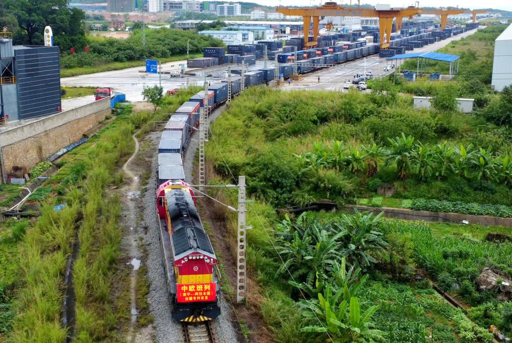5月15日,搭載2600噸白糖的中歐班列從南寧國際鐵路港出發駛向哈薩克斯坦阿拉木圖。新華社記者張愛林攝
