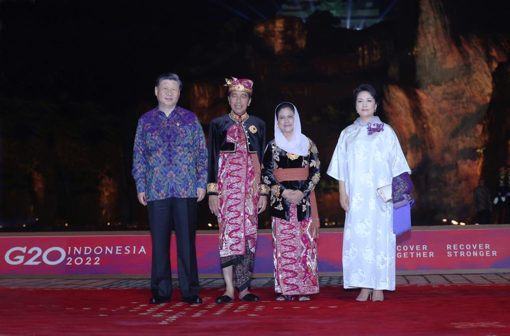當地時間11月15日晚,習近平和夫人彭麗媛出席佐科總統和夫人伊莉亞娜在巴厘島神鷹廣場舉行的二十國集團領導人峰會歡迎晚宴。