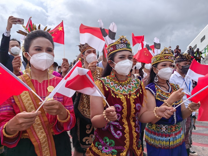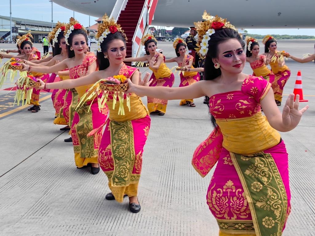 禮兵分列紅地毯兩側致敬,身著民族服裝的當地青年演奏起印尼傳統樂器伽美蘭,盛裝印尼女青年跳起巴厘島傳統舞蹈“朋德舞”,當地學生揮舞中國和印尼兩國國旗,用中文歡呼“歡迎,歡迎!”