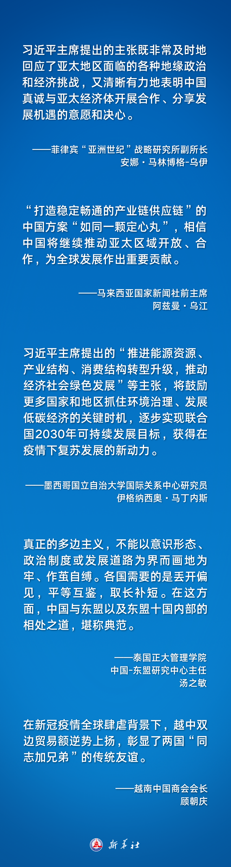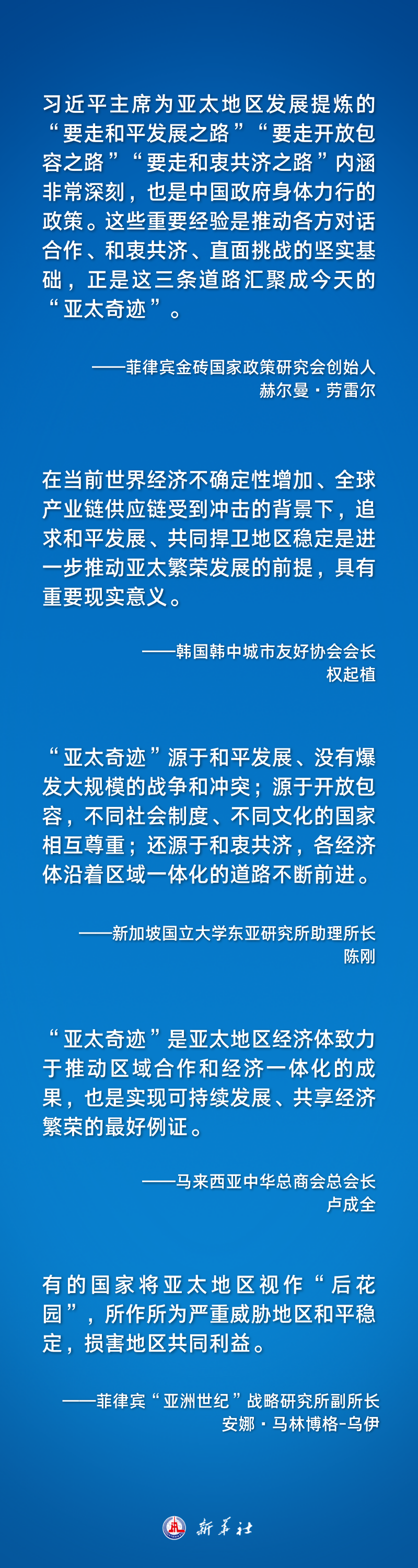 對于亞太未來發展繁榮,習近平主席提出重要主張:要攜手構建亞太命運共同體,再創亞太合作新輝煌。多國人士認為,“維護國際公平正義,建設和平穩定的亞太”“堅持開放包容,建設共同富裕的亞太”“堅持綠色低碳發展,建設清潔美麗的亞太”“堅持命運與共,建設守望相助的亞太”為亞太地區未來發展指明了方向和路徑。