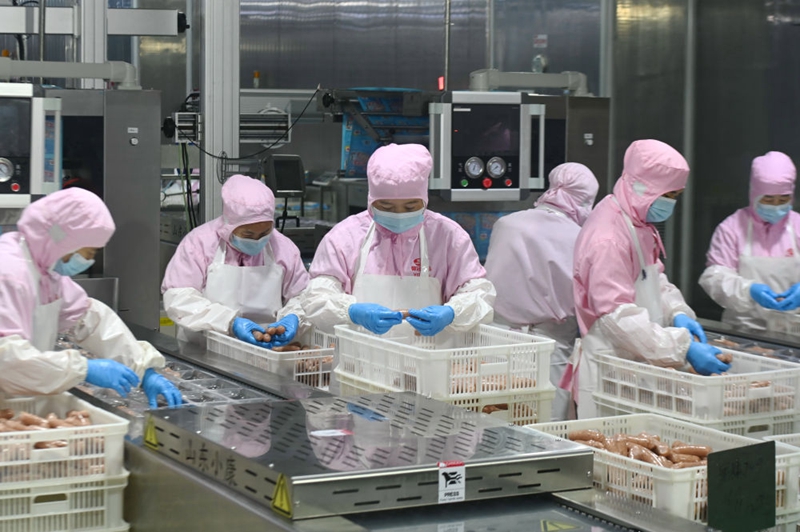 ↑11月16日,在福州元洪投資區,福建御冠食品有限公司員工在食品生產線上檢驗食品質量。