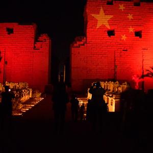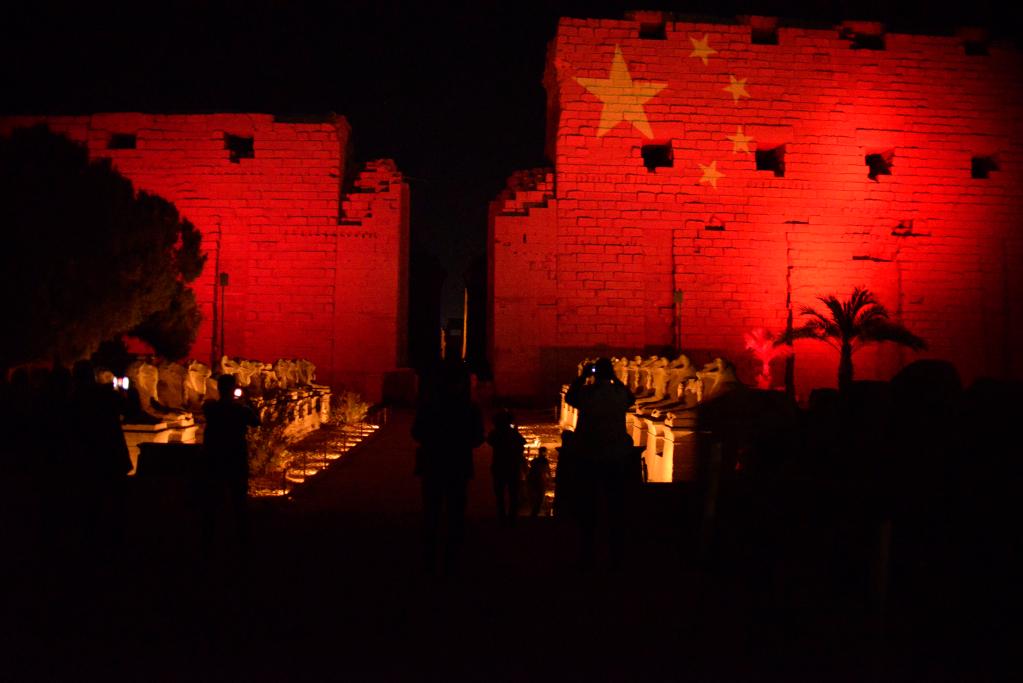 2020年3月1日晚,位于埃及開羅、盧克索、阿斯旺的三大世界文化遺產地以燈光秀的形式同時點亮五星紅旗,以此表達埃及政府和人民對中國抗擊新冠肺炎疫情的支持。圖為當天在埃及盧克索拍攝的卡爾納克神廟。新華社發(拉德萬攝)