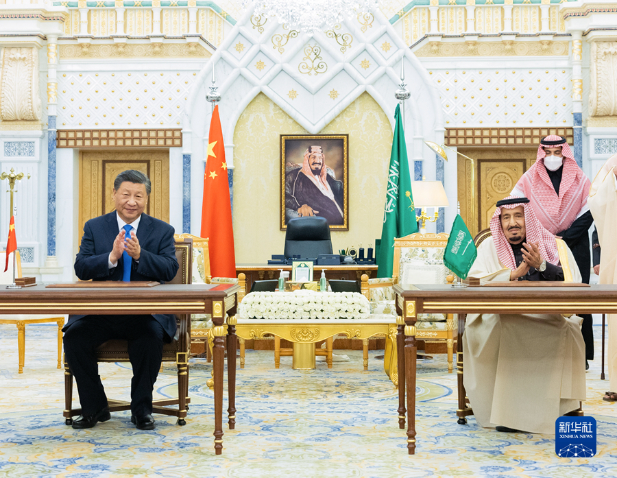 當地時間12月8日下午,國家主席習近平在利雅得王宮會見沙特國王薩勒曼。這是兩國元首親自簽署《中華人民共和國和沙特阿拉伯王國全面戰略伙伴關系協議》,同意每兩年在兩國輪流舉行一次元首會晤。新華社記者 黃敬文 攝