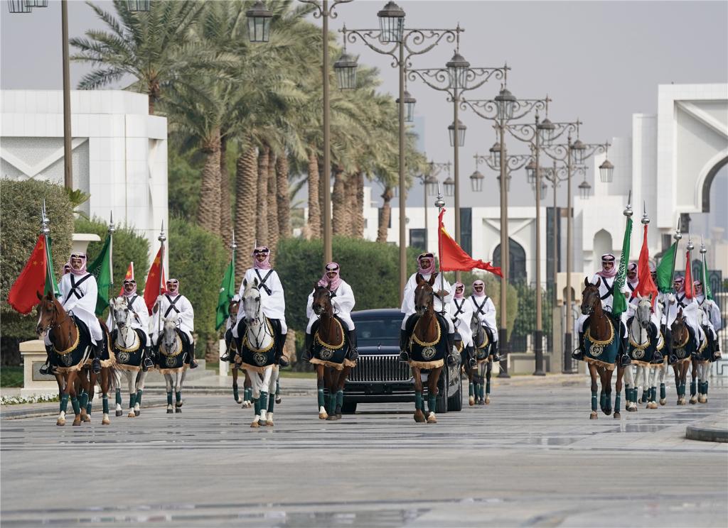 沙特王宮摩托車隊和馬隊護衛習近平專車抵達,沙特王儲兼首相穆罕默德在下車處熱情迎接,習近平在穆罕默德王儲陪同下檢閱王宮儀仗隊,沙特王宮衛隊以傳統執劍禮儀向習近平表示最隆重歡迎。