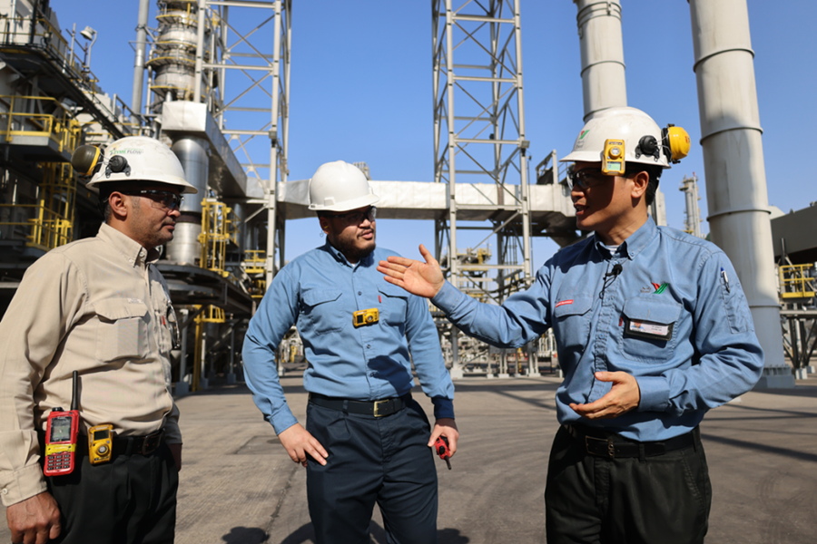 2022年11月27日,在沙特西部城市延布,中沙延布煉廠的員工在交流??偼顿Y86億美元的中沙延布煉廠是中國石化與沙特阿拉伯石油公司合資興建的項目,自2016年1月20日由兩國元首共同啟動投產以來,發展迅速。今年1月至8月累計實現利潤11.5億美元。