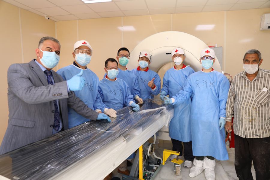 2020年4月12日,在伊拉克首都巴格達,援助伊拉克防治新冠肺炎的中國醫療專家將CT設備搬運到機房后與伊方人員合影。