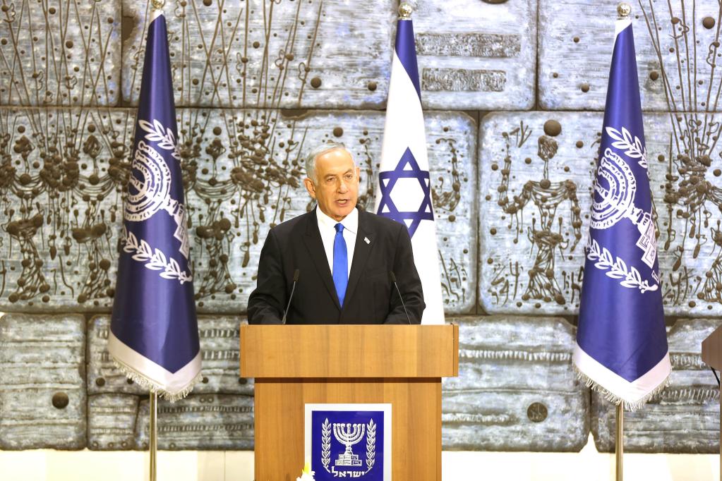 11月13日,內塔尼亞胡在以色列總統府舉行的組建新政府授權儀式上發表講話。(新華社記者王卓倫攝)