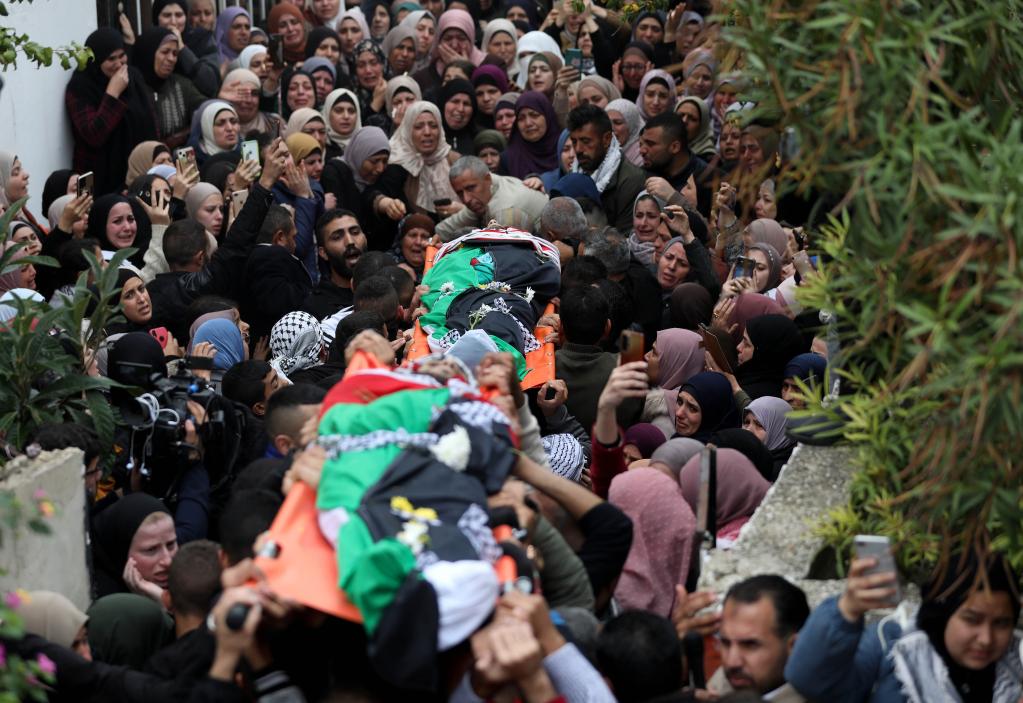 11月29日,在約旦河西岸城市拉姆安拉附近的拜特里馬,人們為被以色列軍隊打死的巴勒斯坦人送葬。新華社發(艾曼·努巴尼攝)