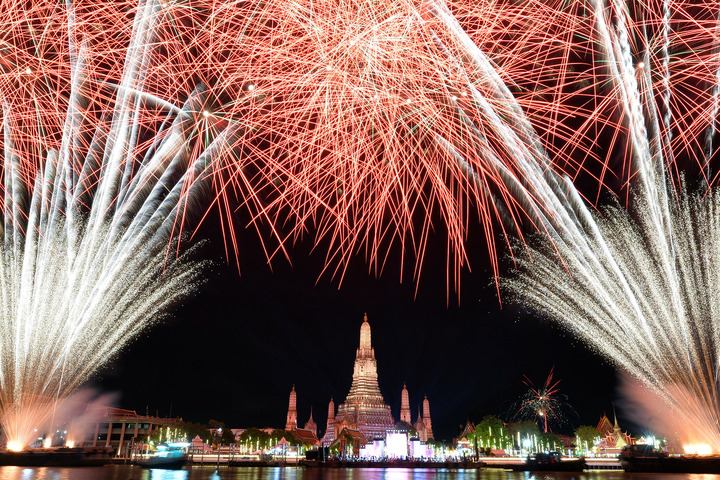 這是2023年1月1日在泰國曼谷鄭王廟上空拍攝的新年煙花。新華社發(拉亨攝)