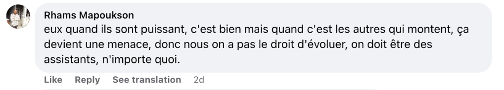剛果(布)網友拉姆斯·馬普克森說:“西方國家主宰世界時便心安理得,非西方國家崛起時便被視為威脅,所以我們不被允許強大,我們只被允許充當附庸。”