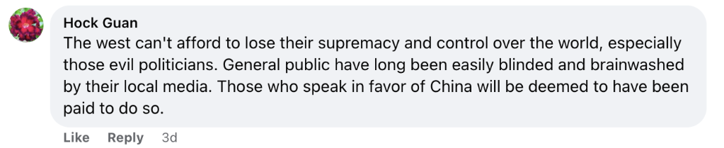 馬來西亞網友關霍克說:“西方不能失去對世界的霸權和控制,尤其是那些邪惡的政客。長期以來,公眾很容易被西方媒體蒙蔽和洗腦。”