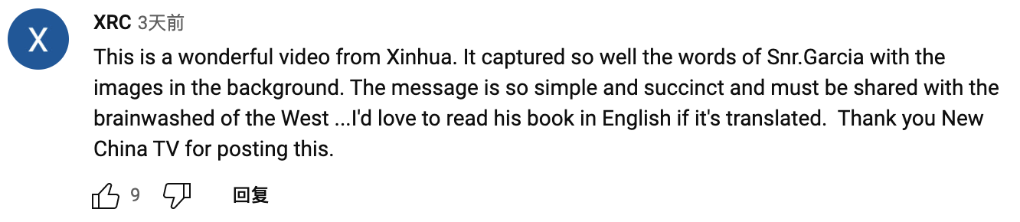 網友XRC留言說:“新華社這條視頻太棒了,它給我們傳達了一個明晰的信息,必須要分享給那些被洗腦的西方人看看。”