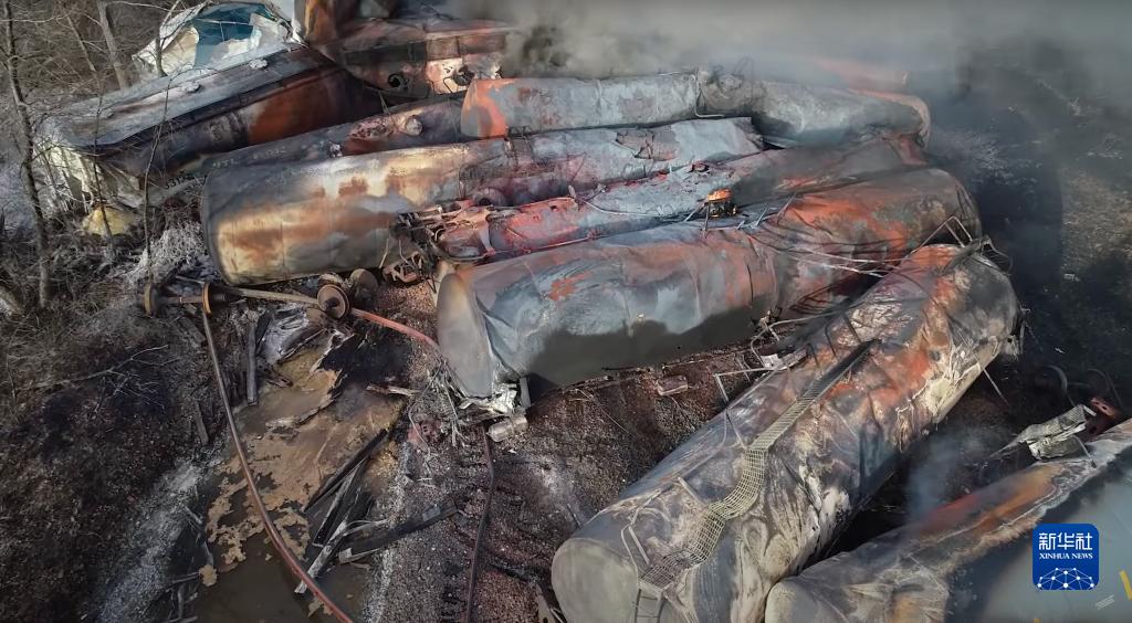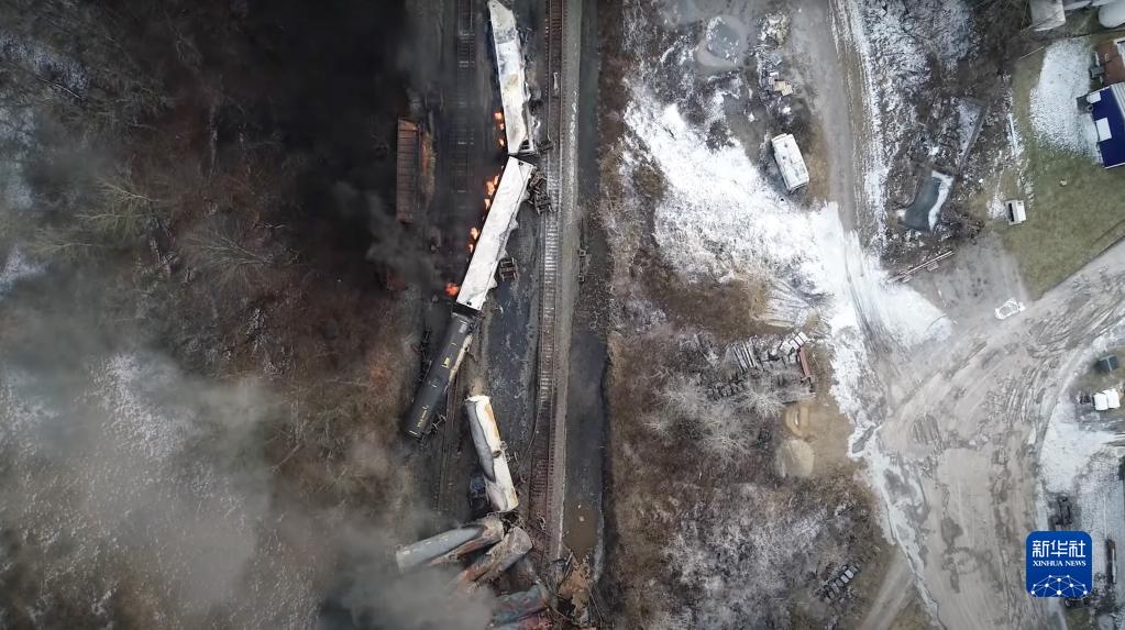 這張美國國家運輸安全委員會發布的無人機視頻截圖顯示的是有毒化學品運載列車脫軌事故現場。新華社發