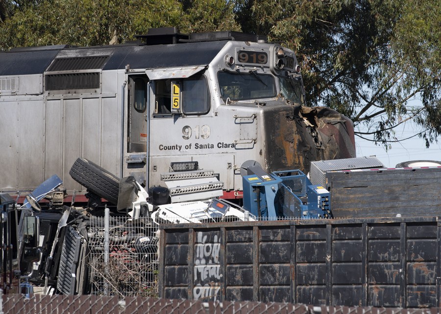 這是2022年3月10日在美國加利福尼亞州圣布魯諾拍攝的事故現場。美國加州圣布魯諾當天發生通勤列車與工程車輛相撞事故,造成13人受傷。新華社發(李建國攝)