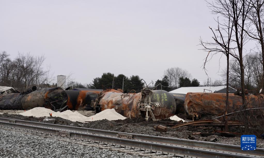 這是2月14日在美國俄亥俄州東巴勒斯坦鎮拍攝的脫軌列車殘骸。新華社發(章焱飛攝)