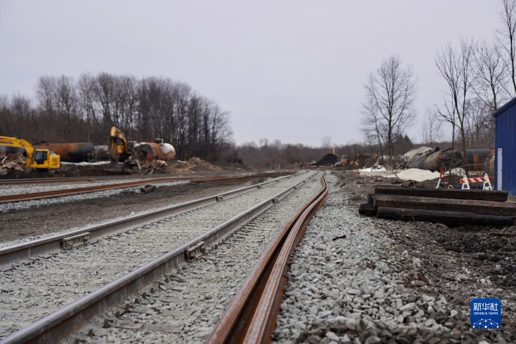 這是2月14日在美國俄亥俄州東巴勒斯坦鎮列車脫軌事故現場附近拍攝的鐵軌。新華社發(章焱飛攝)