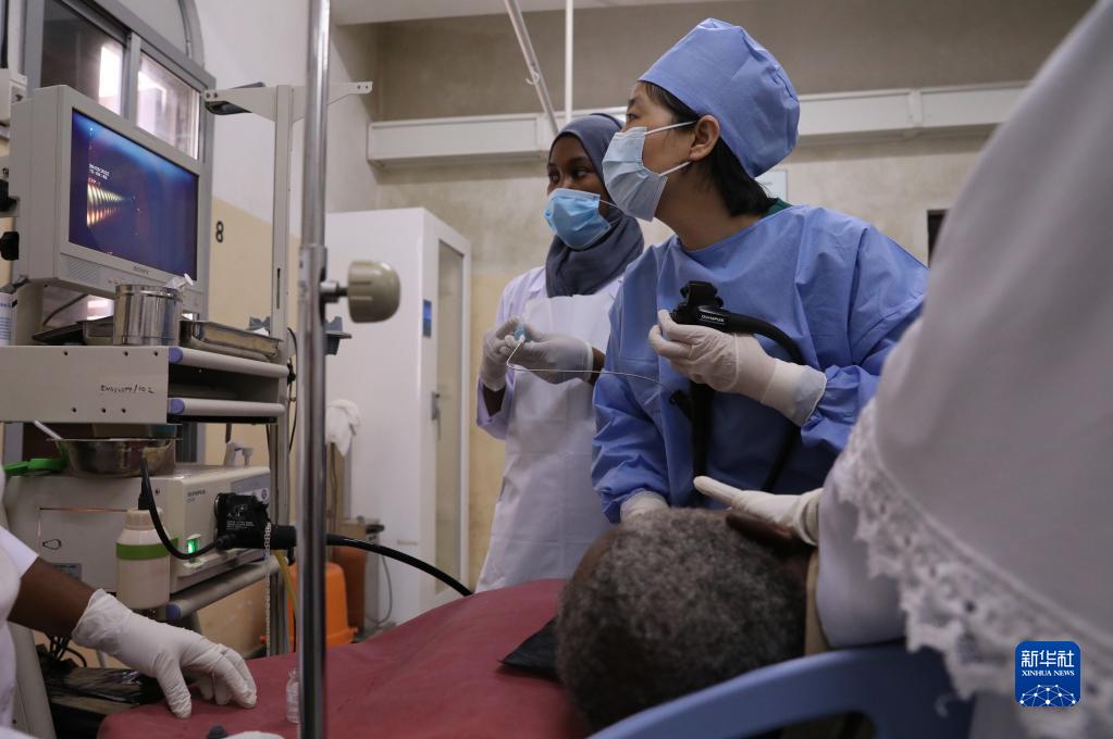 2月22日,在坦桑尼亞桑給巴爾島納茲莫加醫院,消化內鏡中心醫生劉翠霞給病人做檢查。