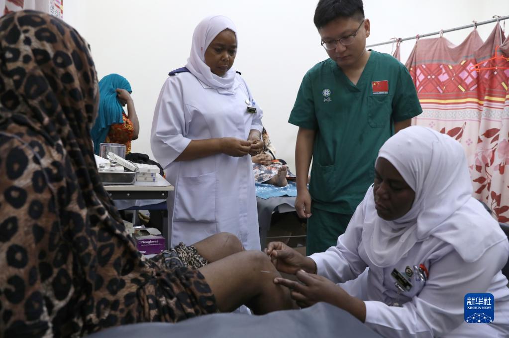 2月22日,在坦桑尼亞桑給巴爾島納茲莫加醫院,針灸科醫生劉亞?。ㄓ叶┎榭串數蒯t生給病人針灸。