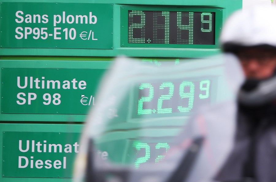 2022年3月16日,一名男子騎摩托車經過法國巴黎一處加油站。(新華社記者高靜 攝)