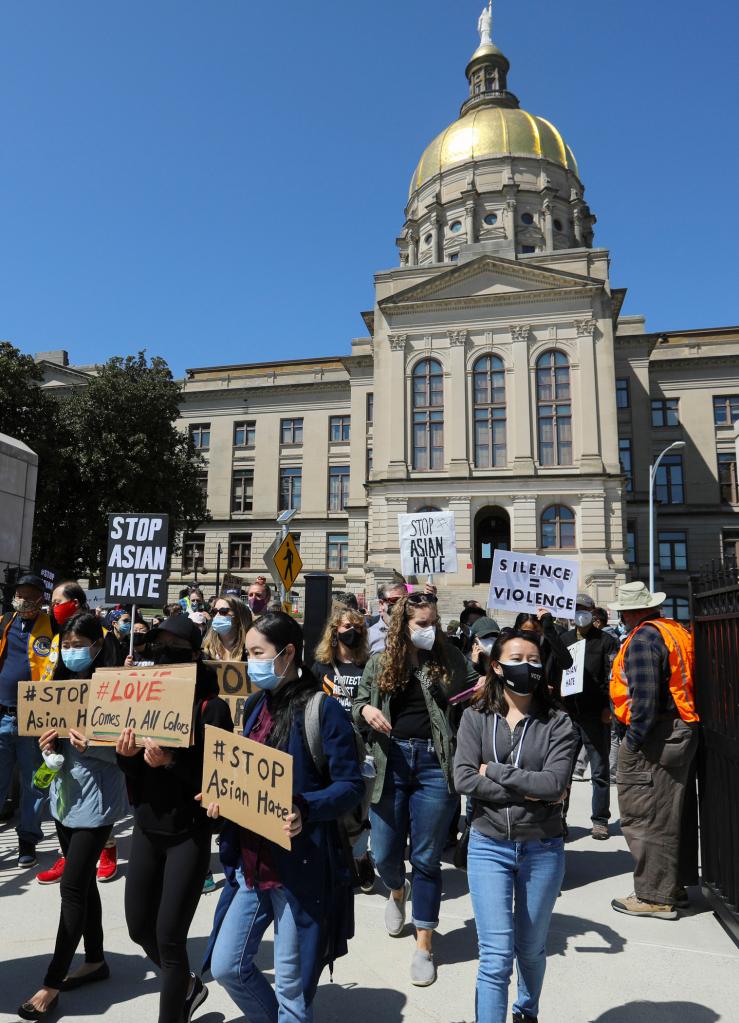 2021年3月20日,人們手持標語在美國佐治亞州亞特蘭大市的佐治亞州議會大廈前舉行集會,抗議針對亞裔的暴力、種族歧視和仇外情緒,要求為亞特蘭大槍擊案受害者伸張正義。新華社發(王曉衡攝)