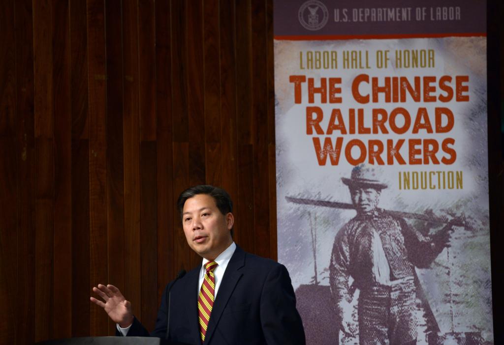 2014年5月9日,在華盛頓美國勞工部,時任美國勞工部副部長盧沛寧出席紀念儀式。當日,美國勞工部舉行紀念儀式,正式將19世紀在美國修筑鐵路的1.2萬名華工載入其榮譽榜。新華社記者殷博古攝