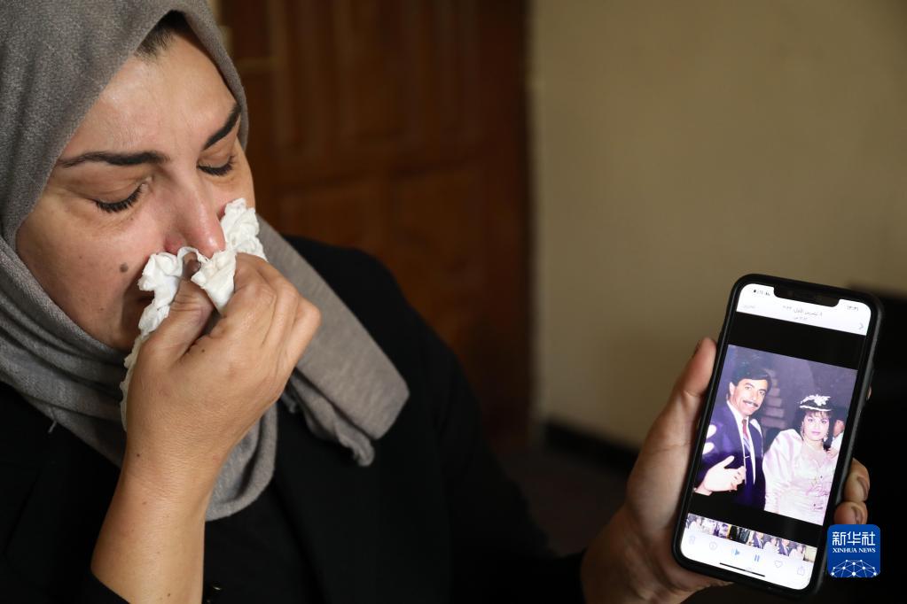 2月14日,在伊拉克北部薩拉赫丁省祖盧耶鎮,松杜絲·拉米展示她和丈夫阿米爾的合影。新華社發(哈利勒·達伍德攝)