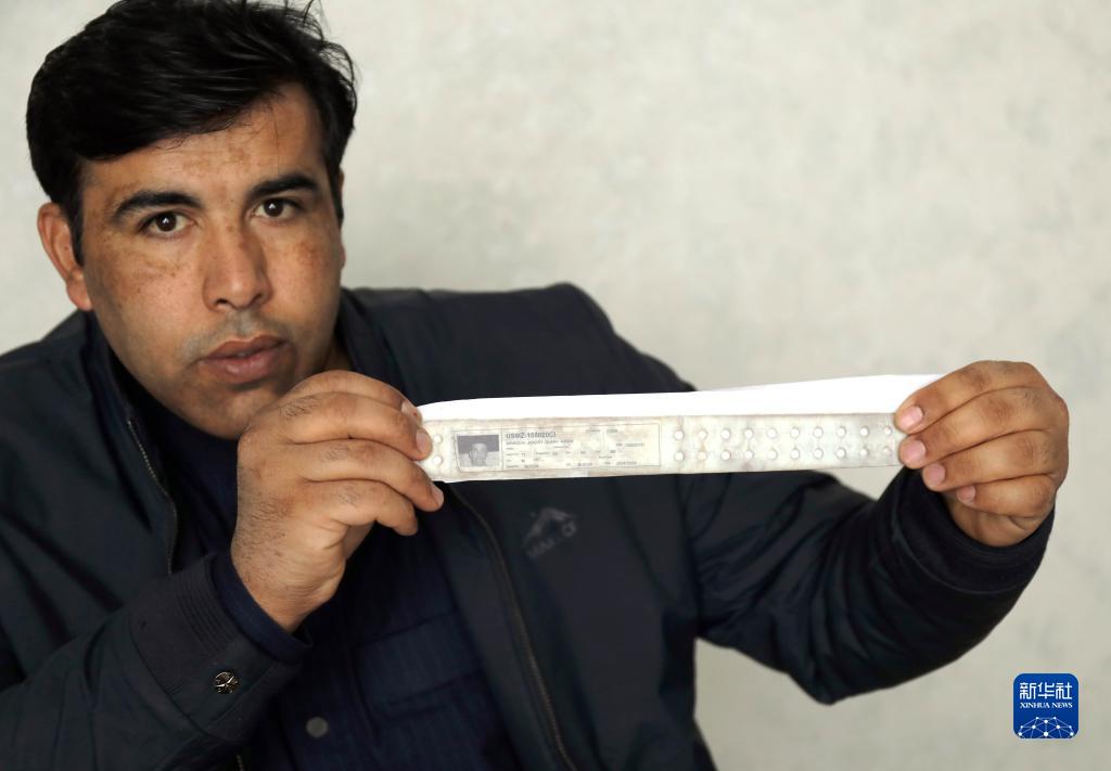 2月17日,在伊拉克北部薩拉赫丁省祖盧耶鎮,阿拉·卡里姆·艾哈邁德展示他在被關押期間所戴的印有個人照片和信息的身份識別手環。新華社發(哈利勒·達伍德攝)