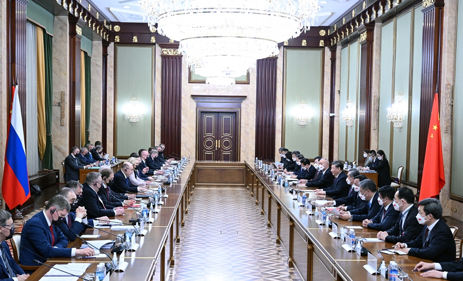 當地時間3月21日上午,國家主席習近平在俄羅斯聯邦政府大廈會見俄羅斯總理米舒斯京。新華社記者 張領 攝