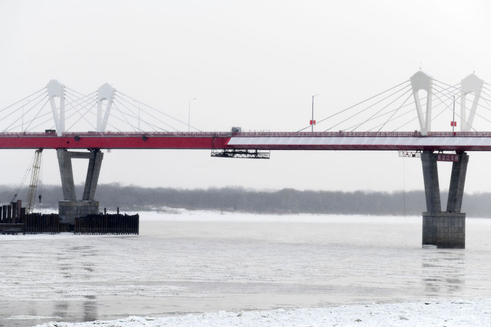 ↑這是中俄首座跨黑龍江公路大橋黑河-布拉戈維申斯克公路橋。這座大橋是兩國元首共同關心推動的重大跨境基礎設施項目,它的開通在中國東北地區和俄羅斯遠東地區之間開辟新的國際運輸通道,成為中俄跨境互聯互通建設的標志。