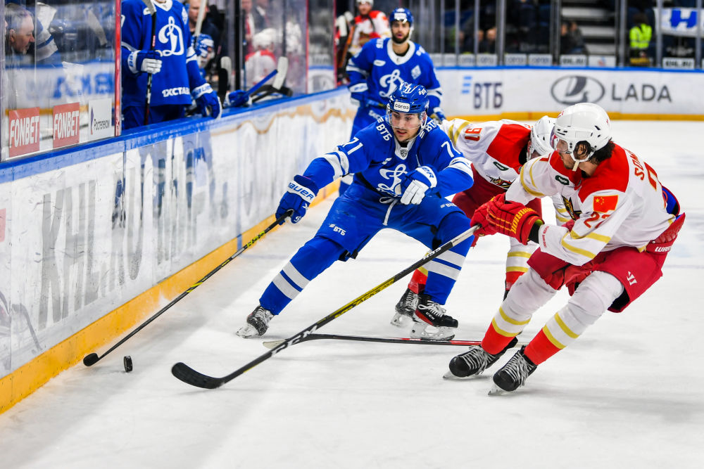 ↑2022年11月19日,中國北京昆侖鴻星隊(紅色)與俄羅斯莫斯科迪納摩隊在莫斯科舉行中俄體育交流年冰球友誼賽。兩國元首親自推動,延續互辦國家主題年的友好傳統,繼“青年友好交流年”“媒體交流年”“地方合作交流年”“科技創新年”后,將2022年和2023年確定為“體育交流年”。