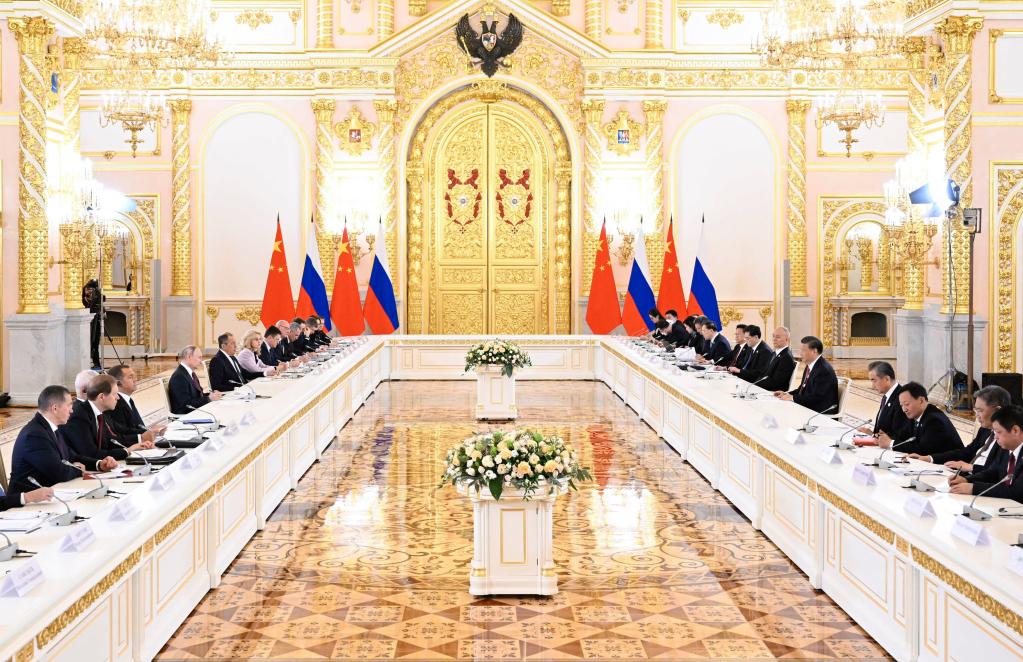 當地時間3月21日下午,國家主席習近平在莫斯科克里姆林宮同俄羅斯總統普京舉行會談。這是兩國元首舉行大范圍會談。新華社記者 申宏 攝