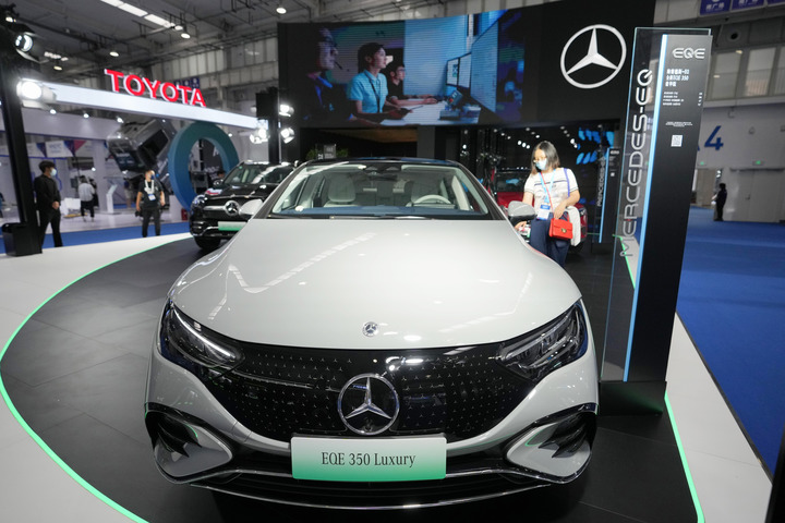 2022年11月6日在第五屆進博會汽車展區奔馳汽車展臺拍攝的新能源汽車。新華社記者金皓原攝