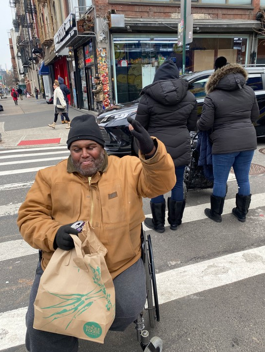在美國另一端的東海岸,紐約市曼哈頓下城包厘街。已是上午10點半,中年男子普林斯·法克斯的早飯還沒有著落。他左腿膝蓋以下殘缺,坐在輪椅上,不停向行人招呼?!白鳛橐幻宋槔媳?,我在挨餓,請救救我,求求你了!”