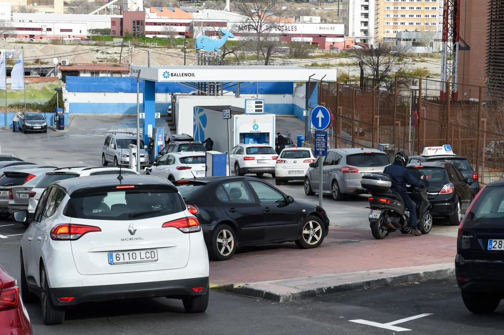 2022年12月31日,在西班牙馬德里,汽車排隊駛入一處加油站加油。(新華社發,古斯塔沃·巴連特攝)