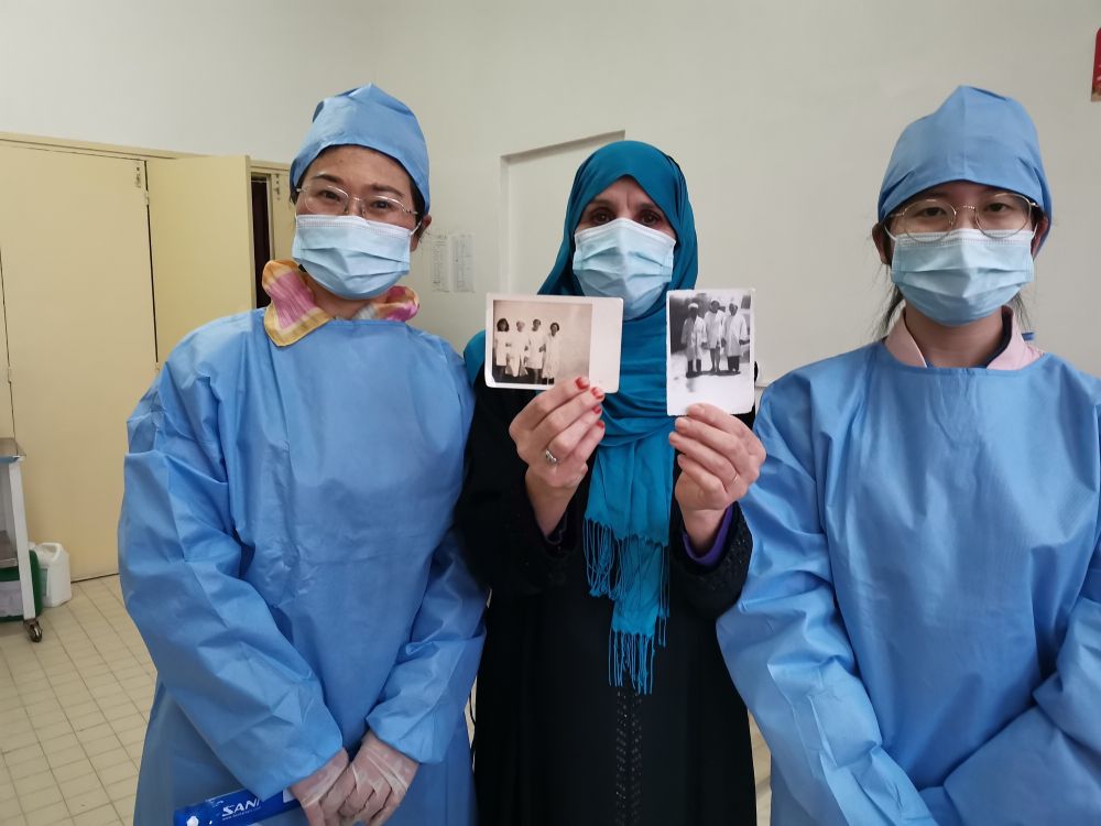 2021年11月14日,在阿爾及利亞阿爾及爾,中國援阿醫療隊醫生楊翊(左)接診的一名患者(中)展示1994年與中國醫生合影的老照片。新華社發(中國援阿爾及利亞醫療隊供圖)