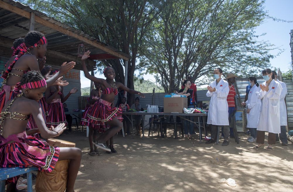 2023年2月16日,中國第14批援納醫療隊來到距納米比亞首都溫得和克市中心約20公里的弗蘭斯藝術培訓中心,對在此學習的學生進行健康檢查。這是藝術培訓中心的同學們用傳統舞蹈感謝中國醫生。新華社發(穆薩·卡薩克攝)