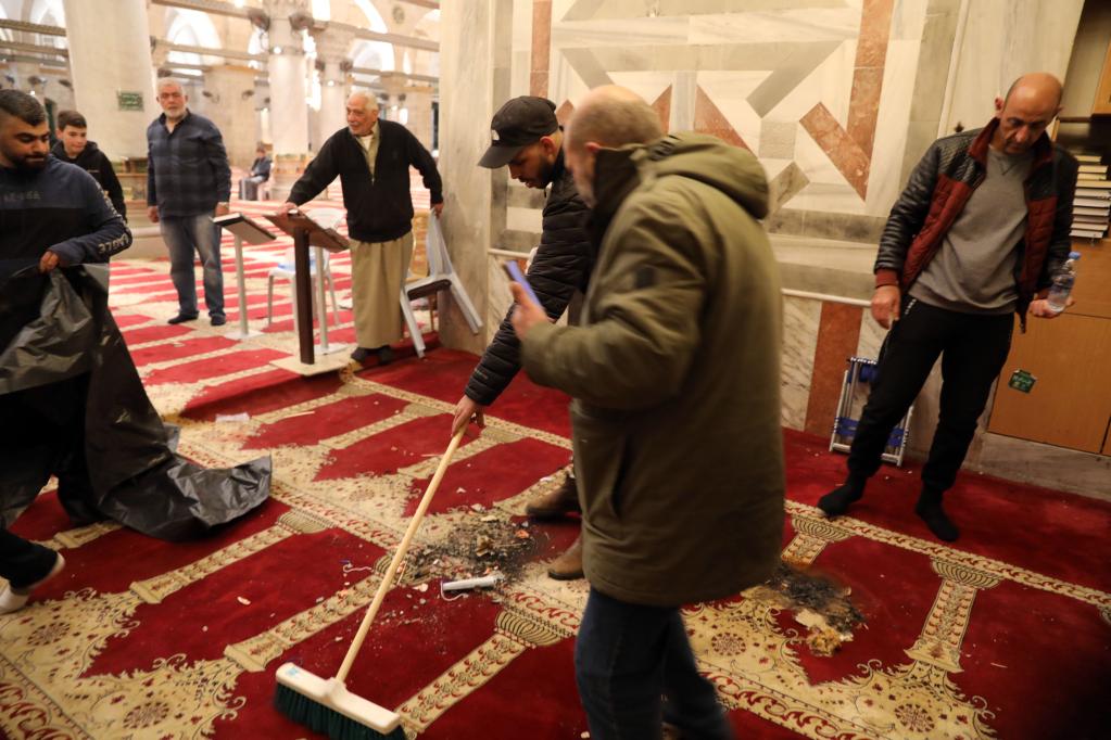 4月5日,人們在耶路撒冷老城阿克薩清真寺清理沖突現場。新華社發(穆阿邁爾·阿瓦德攝)