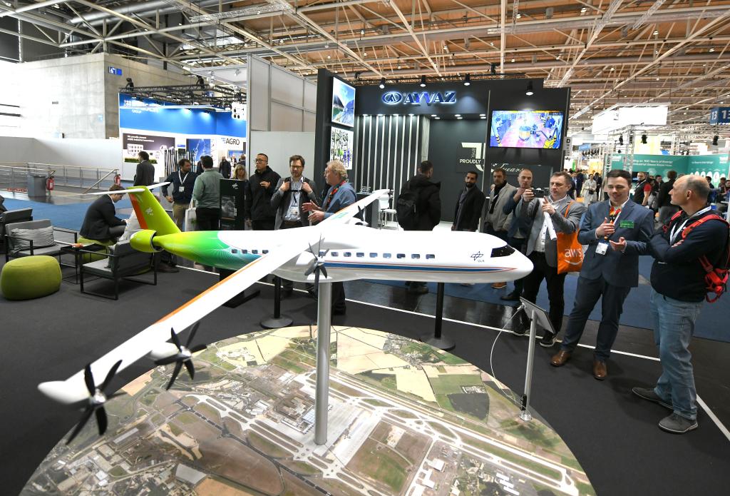 4月17日,人們在德國漢諾威工業博覽會上參觀一款氫能飛機模型。(新華社記者任鵬飛攝)