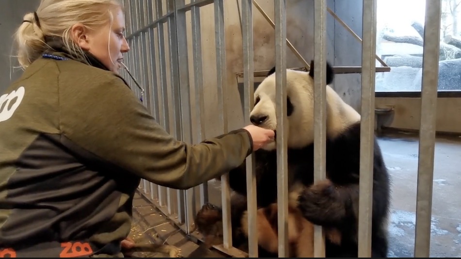 哥本哈根動物園飼養員喂大熊貓食物。視頻截圖