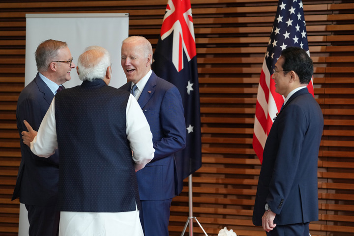 2022年5月24日,在日本東京,澳大利亞總理阿爾巴尼斯、印度總理莫迪、美國總統拜登和日本首相岸田文雄(從左到右)在美日印澳“四邊機制”峰會的歡迎儀式上交流。新華社記者張笑宇攝