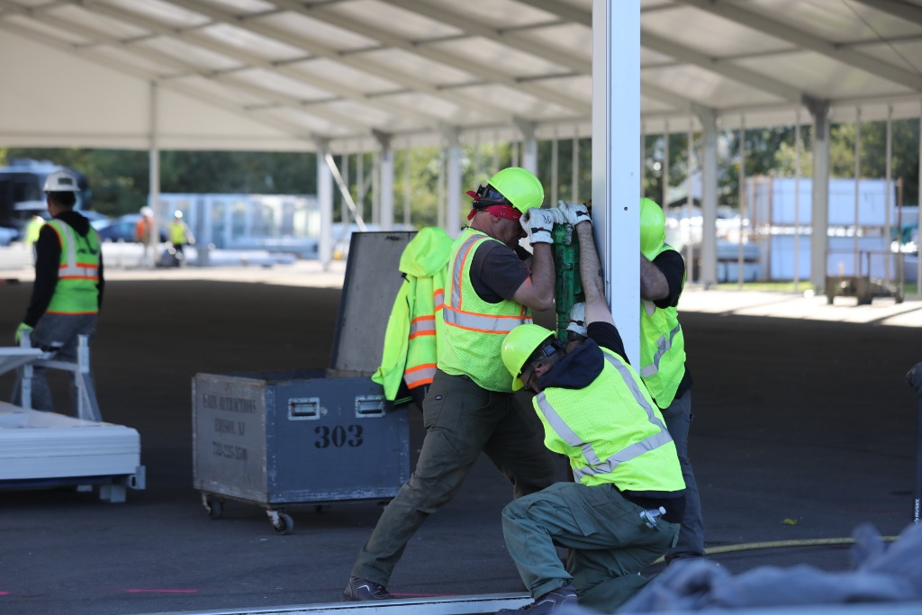 2022年10月9日,工人在位于美國紐約市蘭德爾島的移民救援中心建設工地工作。新華社記者王迎攝