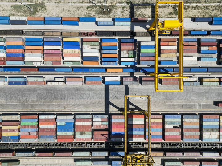在新疆霍爾果斯鐵路口岸,換裝場內在進行班列換裝作業(無人機照片)。新華社記者 郝昭 攝