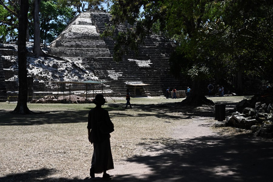 4月1日,游客在洪都拉斯科潘瑪雅古城遺址內參觀。中洪在當地展開考古合作。新華社記者辛悅衛攝