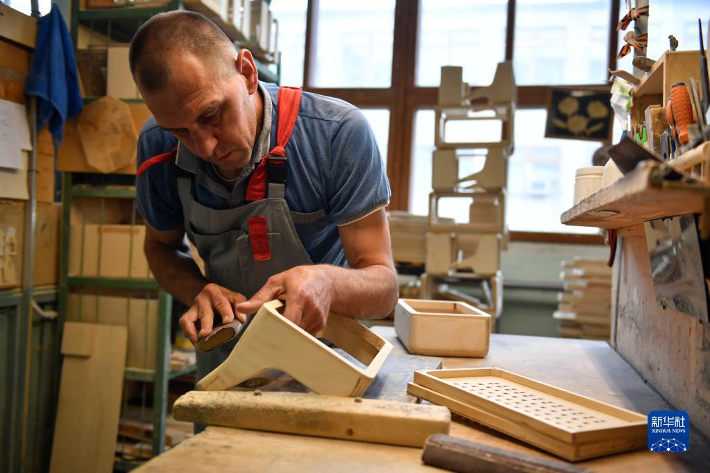 6月7日,工作人員在俄羅斯圖拉制作巴揚手風琴琴身。
