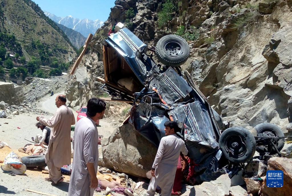 6月8日,在巴基斯坦開伯爾-普什圖省的上迪爾地區,人們聚集在墜入峽谷的車輛周圍。