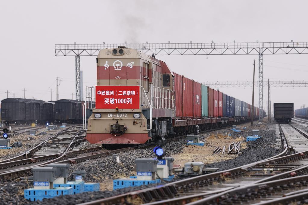 5月4日,一列中歐班列從二連浩特鐵路口岸駛出。新華社發(夏亮 攝)